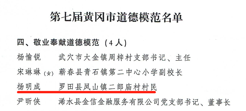 黄冈市第七届敬业奉献道德模范杨明成