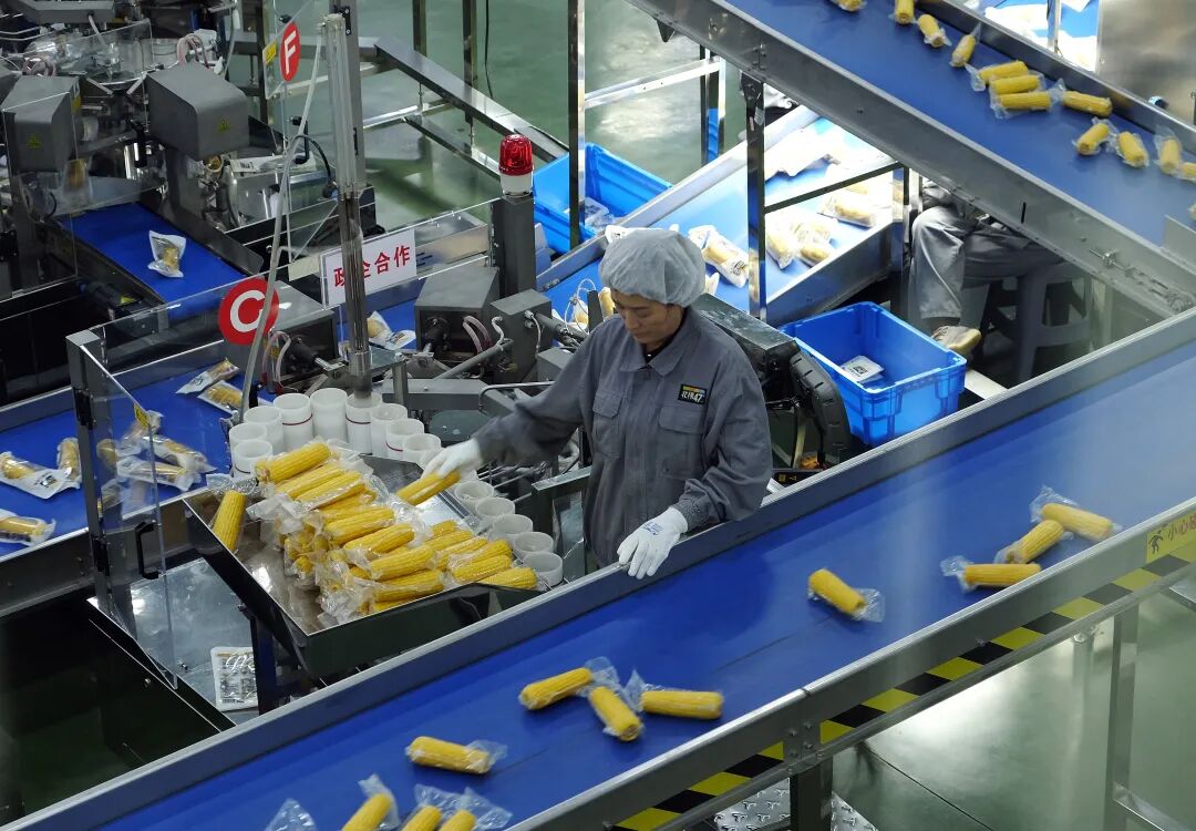 齐齐哈尔市依安县某有机食品有限公司生产车间,工人在分装鲜食玉米。魏海摄(新华社)