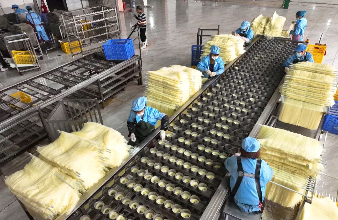 湖南衡阳一家食品企业员工在加工制作粉丝。曹正平摄(新华社)