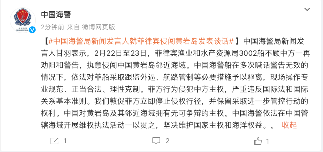 中国海警局新闻发言人甘羽表示,2月22日至23日,菲律宾渔业和水产资源局3002船不顾中方一再劝阻和警告,执意侵闯中国黄岩岛邻近海域。中国海警船在多次喊话警告无效的情况下,依法对菲船采取跟监外逼、航路管制等必要措施予以驱离,现场操作专业规范、正当合法、理性克制。菲方行为侵犯中方主权,严重违反国际法和国际关系基本准则。我们敦促菲方立即停止侵权行径,并保留采取进一步管控行动的权利。中国对黄岩岛及其邻近海域拥有无可争辩的主权。中国海警依法在中国管辖海域开展维权执法活动一以贯之,坚决维护国家主权和海洋权益。