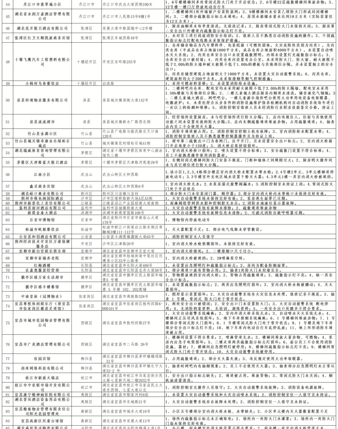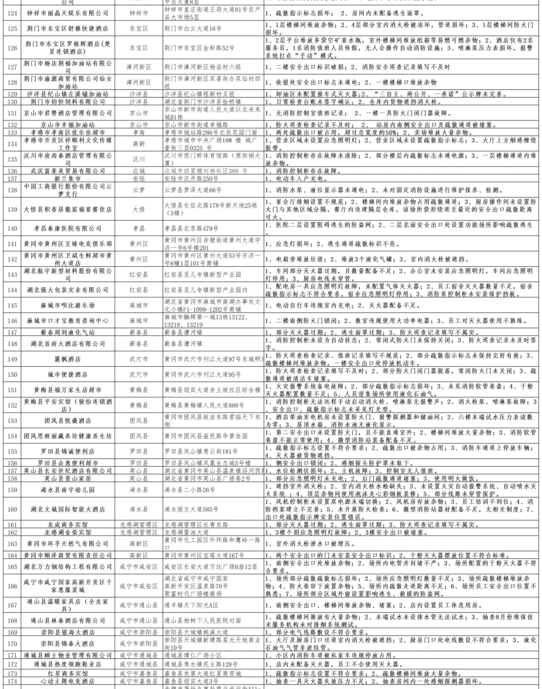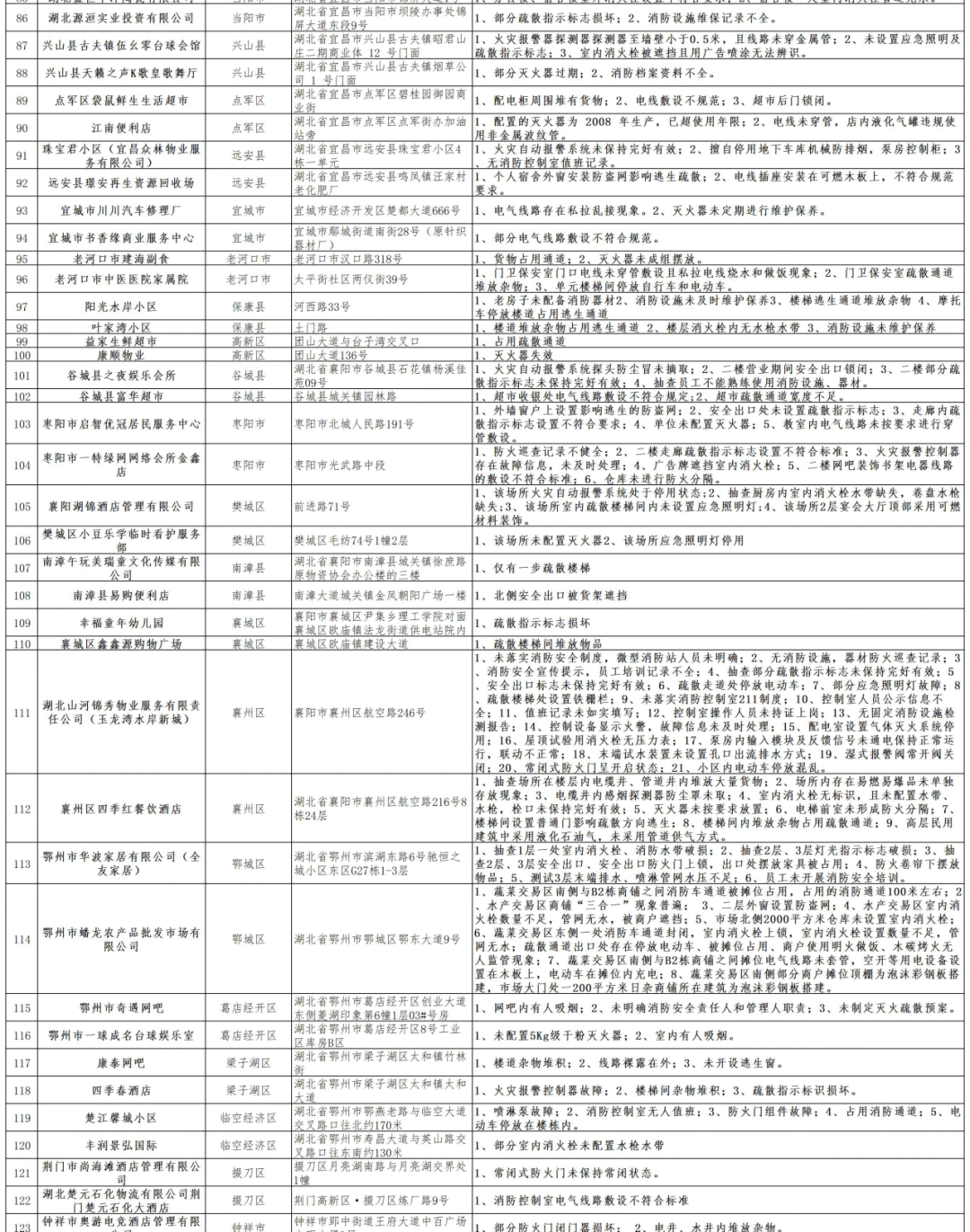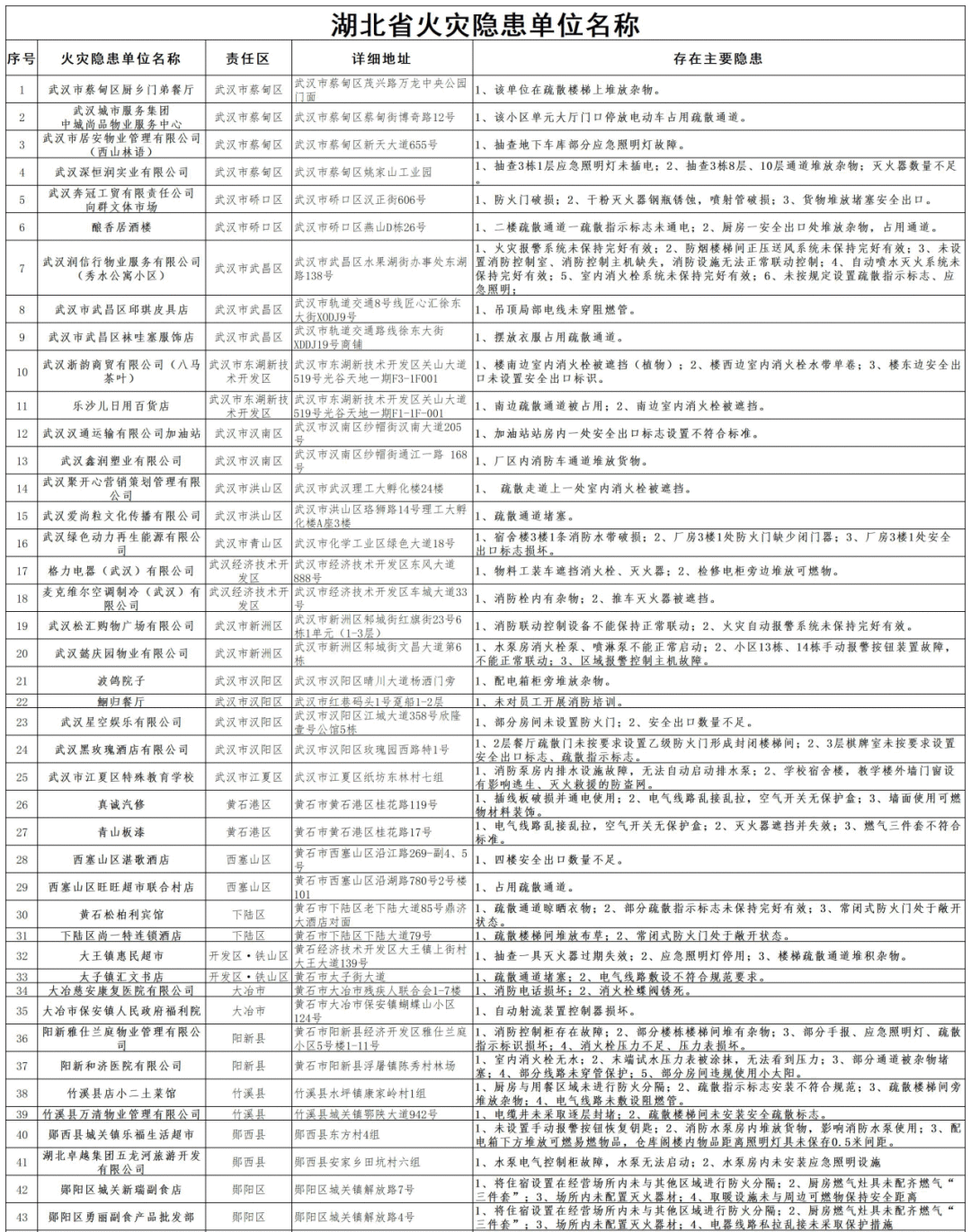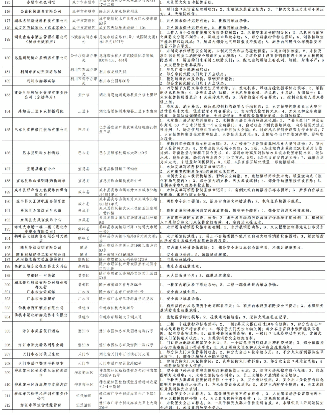 预防为主,生命至上!为坚决遏制防范重特大事故发生,以高水平消防安全保障高质量发展,湖北消防聚焦“九小场所”、多业态混合生产经营场所、人员密集场所等,全面开展拉网式排查整治,现曝光全省212家火灾隐患单位,强化追责问责,推动火灾隐患整改,切实织密消防安全防护网。希望以下单位积极落实消防安全主体责任,及时整改消除火灾隐患。