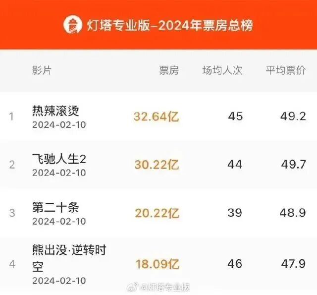 据灯塔专业版数据显示,截至25日,2024年春节档4部影片《热辣滚烫》《飞驰人生2》《第二十条》《熊出没·逆转时空》合计票房突破100亿。