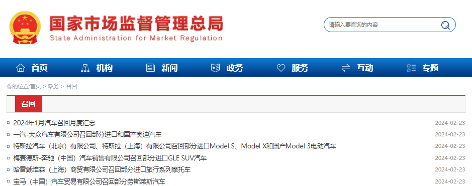 日前,特斯拉汽车(北京)有限公司、特斯拉(上海)有限公司根据《缺陷汽车产品召回管理条例》和《缺陷汽车产品召回管理条例实施办法》的要求,向国家市场监督管理总局备案了召回计划。自即日起,召回生产日期在2023年1月27日至2024年1月7日期间的部分进口Model S、Model X电动汽车,共计1071辆;生产日期在2023年9月12日至2024年1月12日期间的部分国产Model 3电动汽车,共计7629辆。