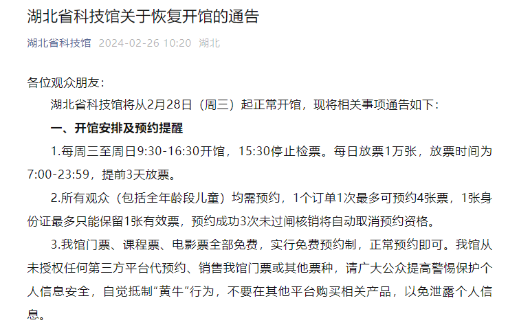 2月26日东湖海洋世界、嘟噜动物主题公园、东湖大马戏、冰雪大世界已恢复正常营业。武汉欢乐谷开园,营业时间为9:00—18:00。武汉紫薇都市田园、新洲花朝河湾景区、凤娃古寨景区恢复正常营业。2月27日武汉野生动物王国恢复开园,具体开放时间9:00—17:00,周末及节假日开放时间为9:00—17:30。《知音号》恢复演出。此外,3月1日起,每周二至周日10:00—16:30,知音号白天的展览式体验项目“时光码头”也将正式恢复,它在游轮和码头实景中讲述武汉革命历史的真实故事,以“江、船、人”构成长江上的活态博物馆,让观者感受知音文化,共鸣武汉精神。《夜上黄鹤楼》将于19:30正式恢复演出。武汉市中山舰博物馆恢复开放。2月28日木兰草原景区恢复正常营业。湖北省科技馆恢复开馆,开放时间为每周三至周日9:30—16:30。