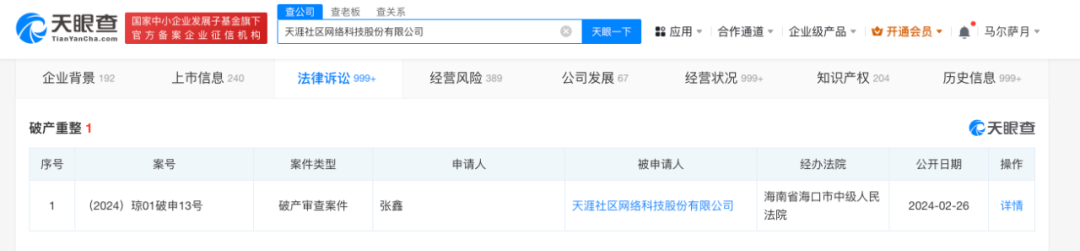 天眼查App显示,2月26日,天涯社区网络科技股份有限公司新增一则破产审查案件,申请人为张鑫,经办法院为海南省海口市中级人民法院。
