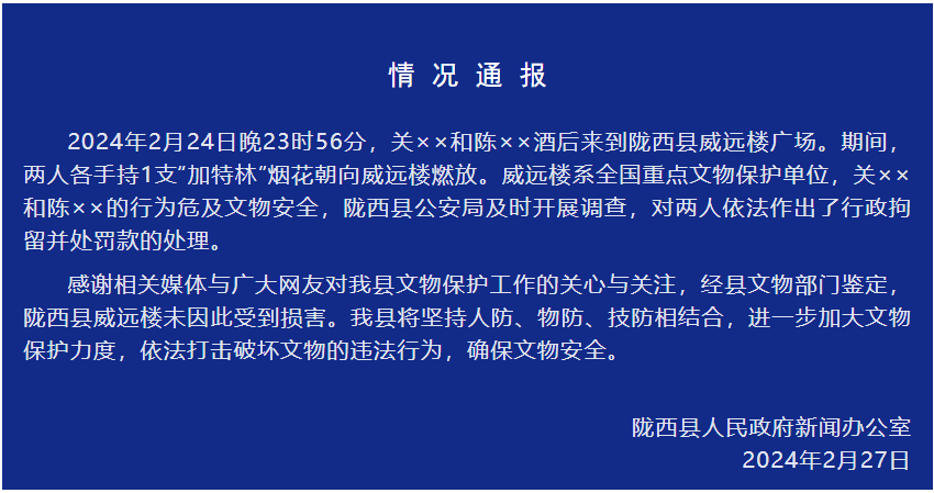威远楼系全国重点文物保护单位,关××和陈××的行为危及文物安全,陇西县公安局及时开展调查,对两人依法作出了行政拘留并处罚款的处理。