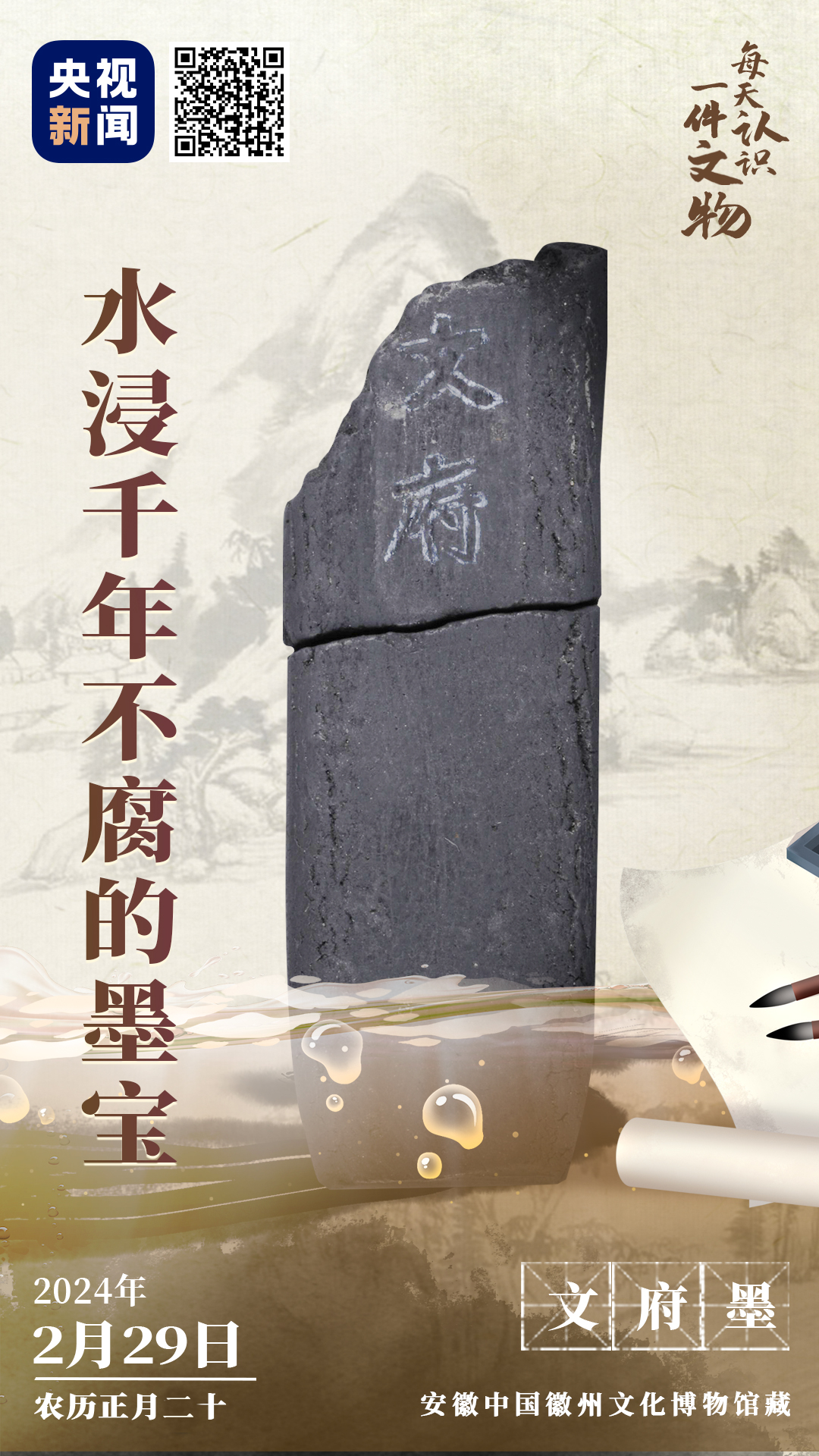 文府墨,整体呈扁长条状,正反面均素底无纹饰,两侧边缘有弧度,根据墨面的字迹勾描,正面残留为楷书“文”“府”二字,反面残留为楷书“制”字。它是目前存世最早的徽墨实物,同时作为水中出土文物在我国墨业实属首例。