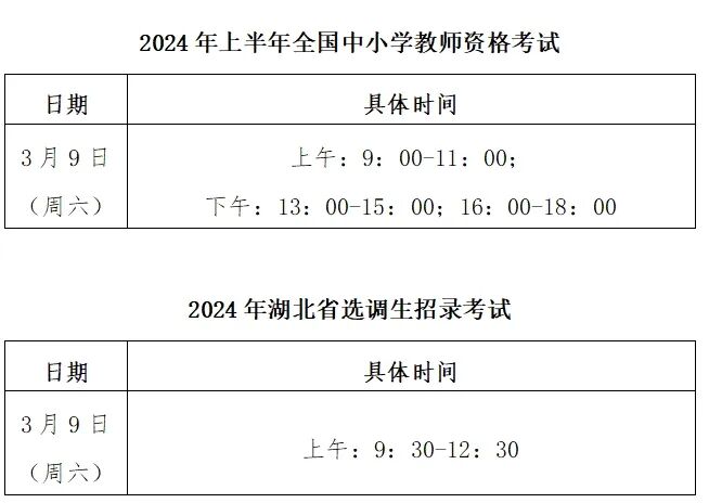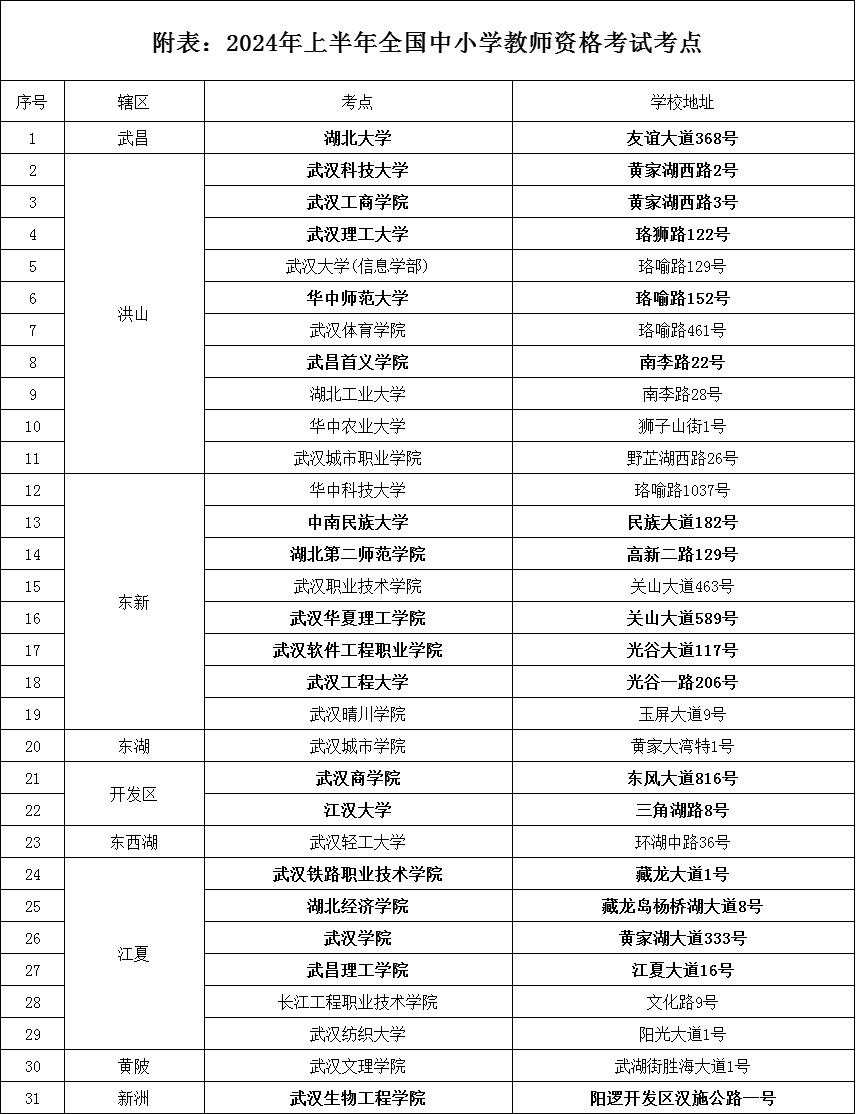 其中,2024年上半年全国中小学教师资格考试涉及31个考点,2024年湖北省选调生招录笔试设6处考点(详见附表)。