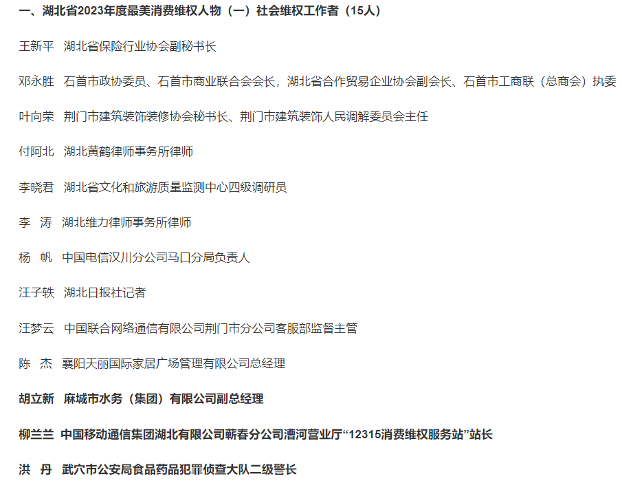 日前,省消委通报湖北省2023年度“最美消费维权人物”,宣传选树情况,共评选出30名最美消费维权人物,黄冈3人入选。(详情)