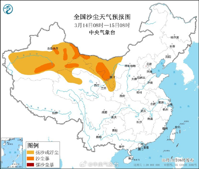 今春沙尘季开始了。根据中央气象台预报,3月14日至17日,受冷空气大风影响,西北地区大部、华北等地自西向东有一次沙尘天气过程。中央气象台3月13日18时发布沙尘暴蓝色预警 ,3月14日6时继续发布沙尘暴蓝色预警。