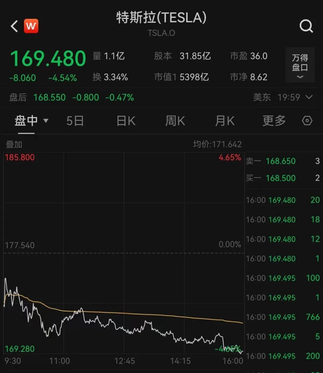 当地时间3月13日,特斯拉低开低走。据Wind数据,截至收盘,特斯拉下跌4.54%,最新股价为169.48美元,最新总市值为5397.58亿美元,市值一夜蒸发256.71亿美元,约合人民币1846亿元。