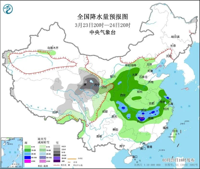 中央气象台预计,23日20时至24日20时,西藏东部、青海东部、甘肃东南部、川西高原北部等地部分地区有小到中雪或雨夹雪,其中,青海东部等地部分地区有大到暴雪。西北地区东部、华北南部和西部、河南北部、江淮东部和南部、江汉东部、江南北部、西南地区东北部等地部分地区有中到大雨,其中,安徽南部、江苏中部、湖北东部、湖南中北部、江西北部、重庆东北部等地部分地区有暴雨或大暴雨。