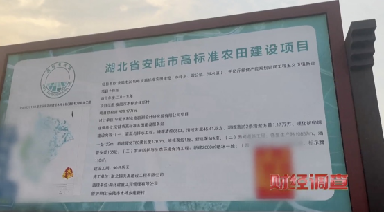 工作人员的说法和村民们反映的情况大相径庭,真实的情况究竟是什么?就在距离这片光伏阵列仅一路之隔的地方,记者看见了一块湖北省安陆市高标准农田建设项目公告牌。