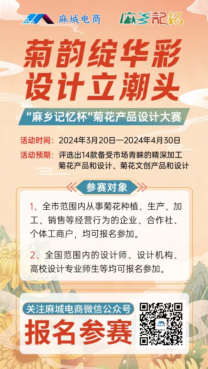 根据《商务部等9部门关于推动农村电商高质量发展的实施意见》(商流通函〔2024〕39号)文件精神,结合市领导在全市三级干部大会上对电商和产业发展的工作要求,为加快麻城菊花产业高质量发展,丰富菊花销售产品类目,打造一批符合线上线下同步销售的网红产品,充分调研生产企业和市场需求,挖掘菊花文化,提升麻城菊花品牌形象,赋予菊花产品文化内涵,举办此次设计大赛活动。