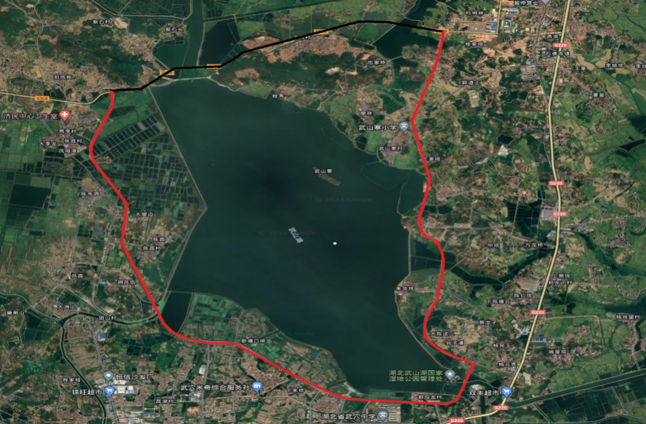 (二)程家林大桥区段对S308程家林大桥全桥进行封闭(黑色标注),车辆沿周边环湖路通行(红色标注)。