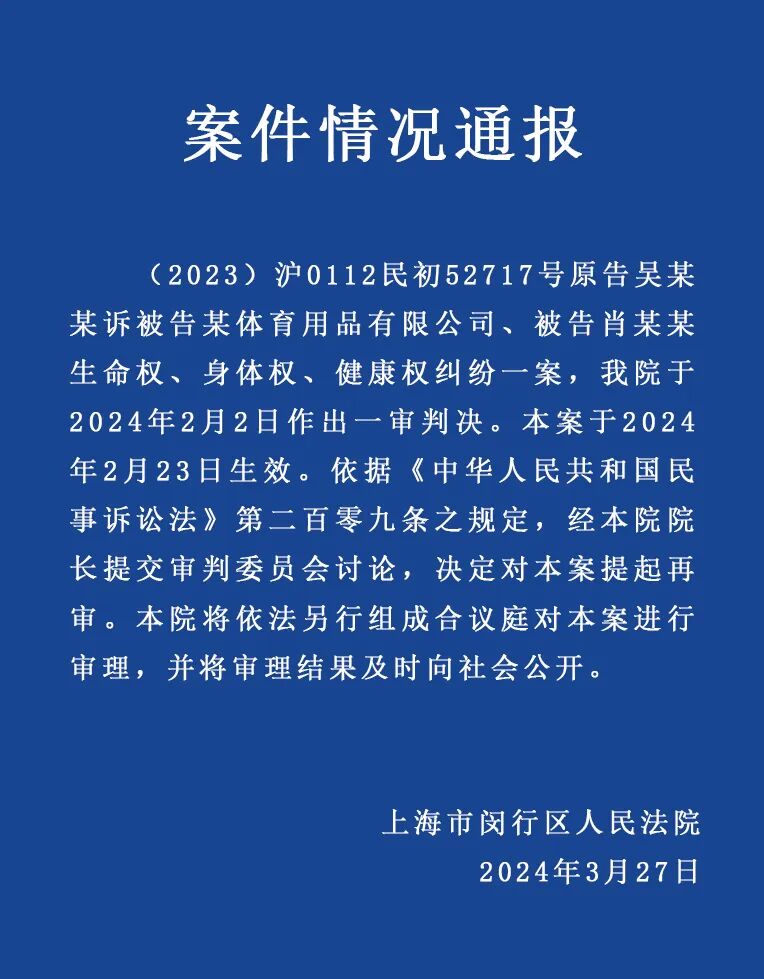 27日,上海闵行法院发布案件情况通报,经审判委员会讨论,“羽毛球馆踩猫绊倒致伤残”一案将提起再审。