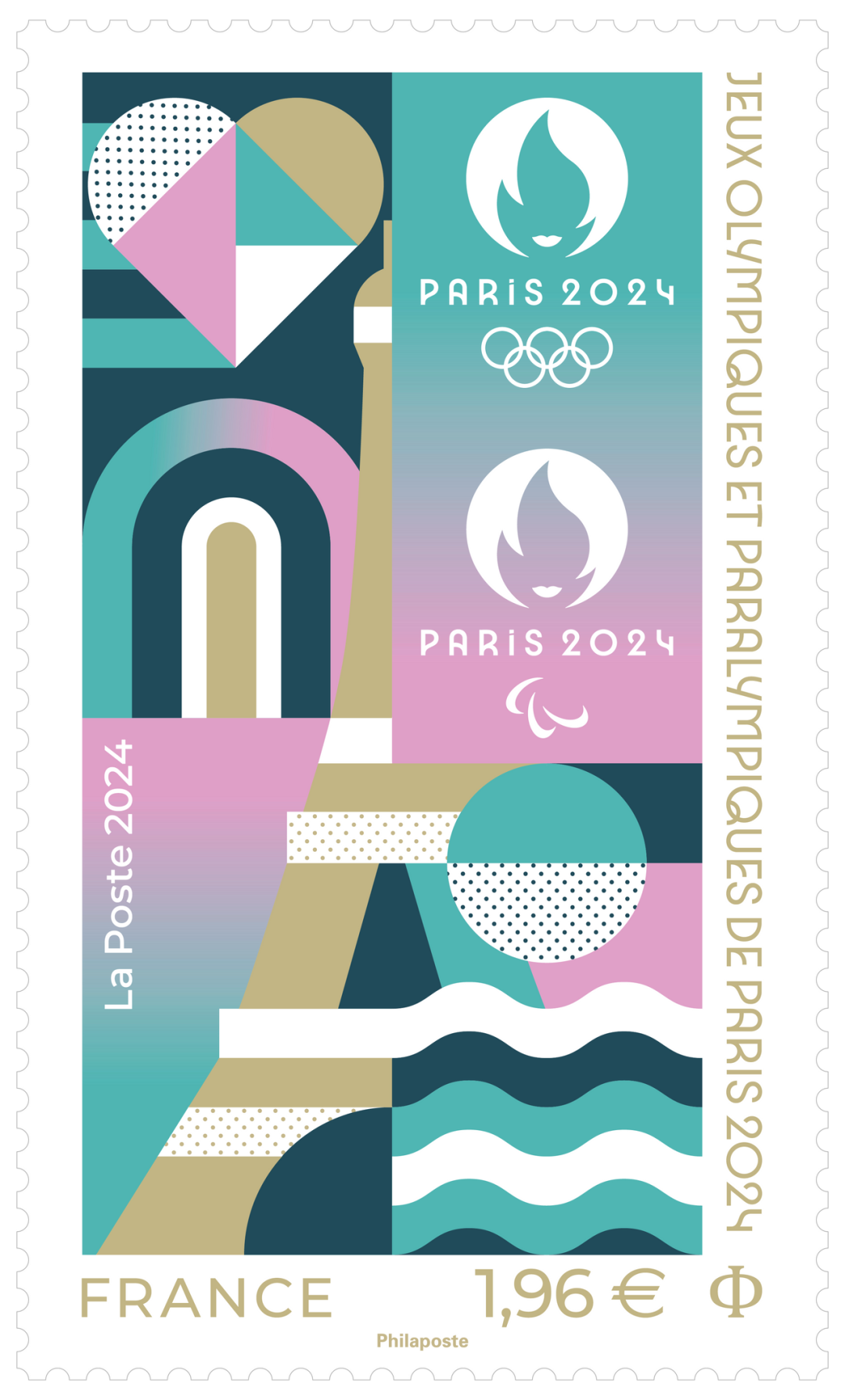 △该邮票设计灵感取自巴黎奥运会视觉标识,采用烫金工艺的精美装饰,并融入巴黎标志性景点埃菲尔铁塔及塞纳河的形象。