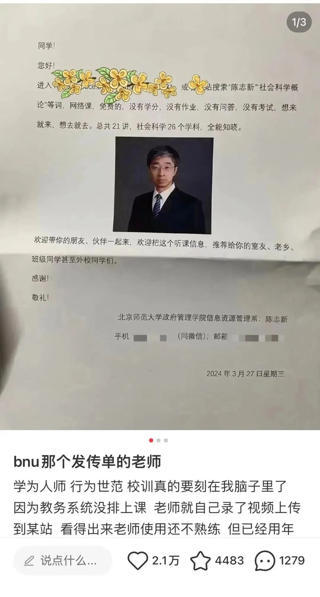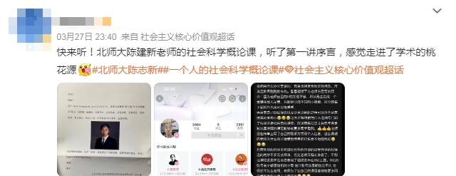 学生发文称北京师范大学副教授陈志新在校内发传单推荐自己一门叫做“社会科学概论”的课程