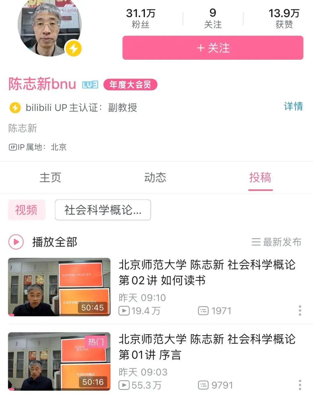 在陈志新老师的B站主页,他的这门社会科学概论涵盖包括序言、如何读书、自然科学、哲学、美学、新闻传播学、人工智能、历史学、考古学、宗教学、伦理学、心理学、法学、军事、文学艺术等多门学科内容,最长一个视频时长超过一个小时,每节课都会在下课的课件上打上“再见”两个字,仪式感满满。