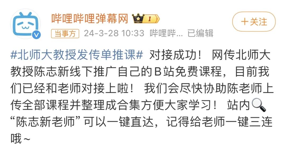 3月28日,B站回应此事称,“目前我们已经和老师对接上啦!我们会尽快协助陈老师上传全部课程并整理成合集方便大家学习!”。
