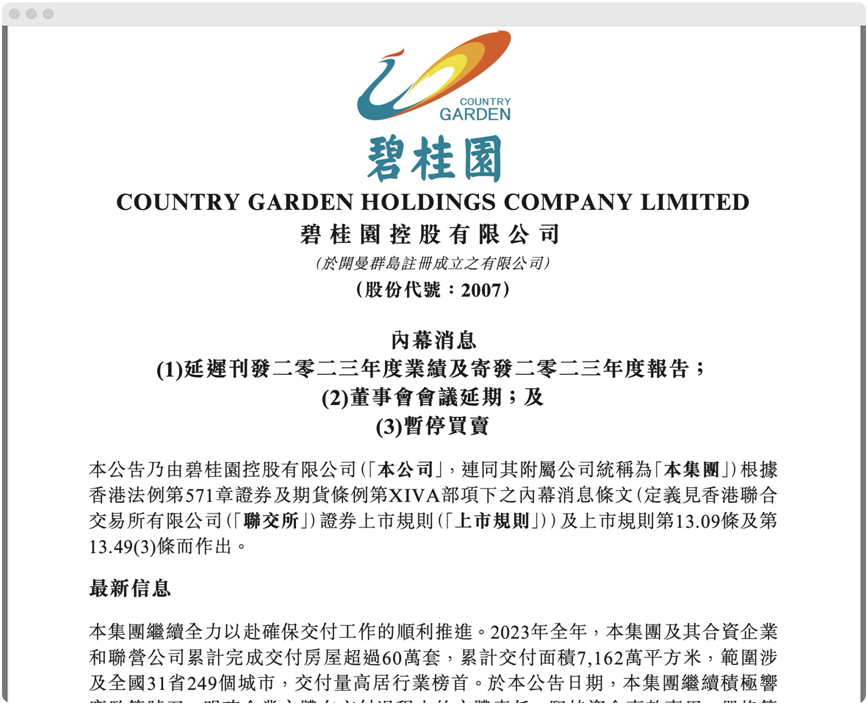 3月28日晚间,碧桂园发布公告称,延迟刊发2023年度业绩及寄发2023年度报告。