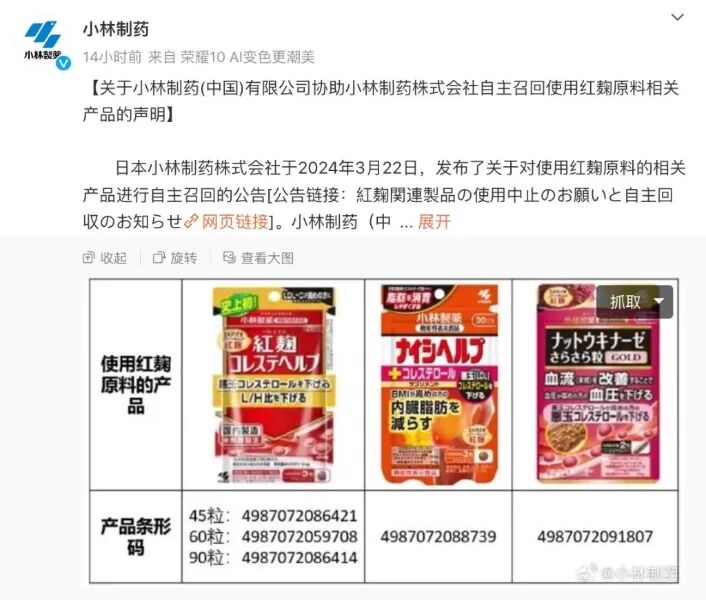 小林制药产红曲致命?