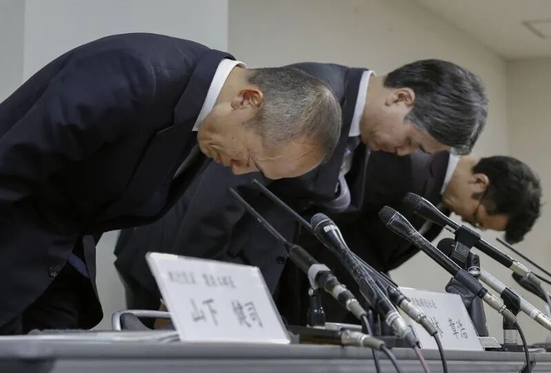 3月22日,在日本大阪,小林制药公司社长小林章浩(左一)在记者见面会上鞠躬致歉。新华社/共同社