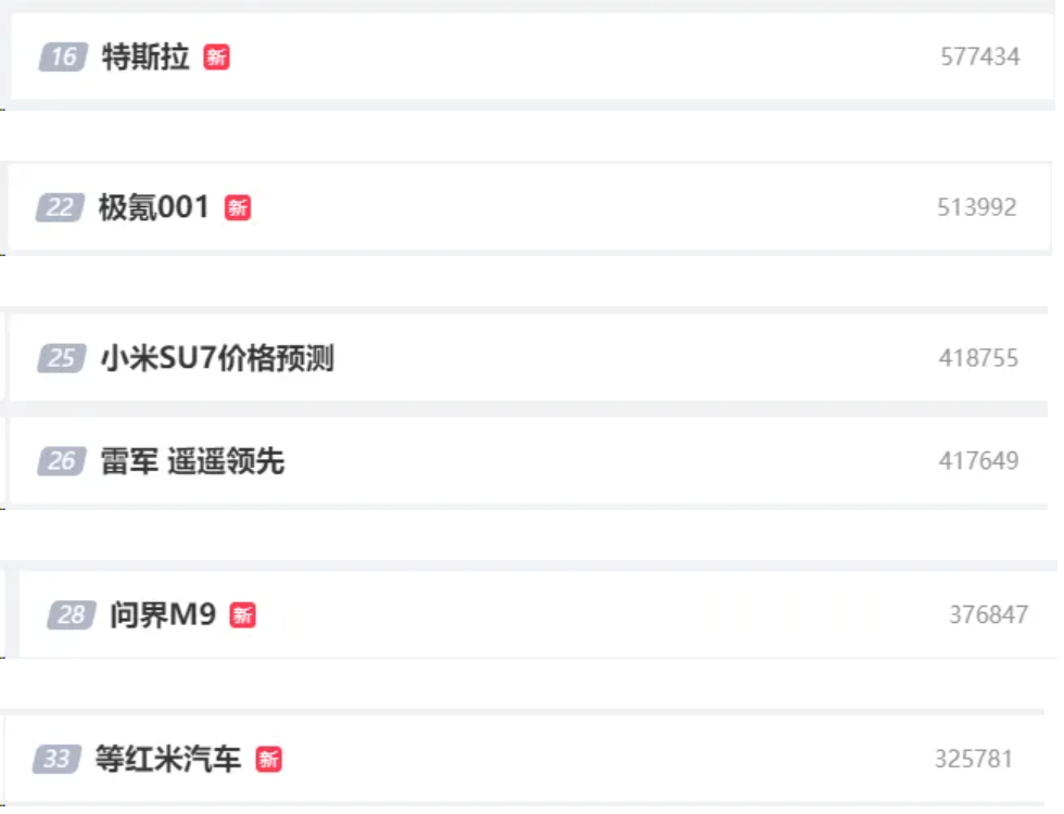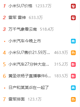 3月28日晚,备受瞩目的小米汽车SU7发布会落幕,吊足人胃口的定价之谜终于揭晓。当晚,“小米汽车SU7价格”“雷军 雷神”话题直接爆了,还有多个相关话题霸屏微博热搜榜。此外,连带友商“特斯拉”“问界M9”“比亚迪”“蔚来”等也冲上热搜。