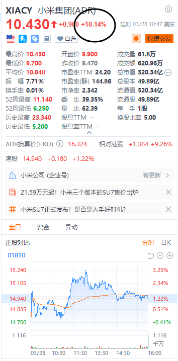 资本市场给予了小米集团较好的反馈。3月28日晚间,小米集团(ADR)一度涨超10%,现报10.43美元/股。