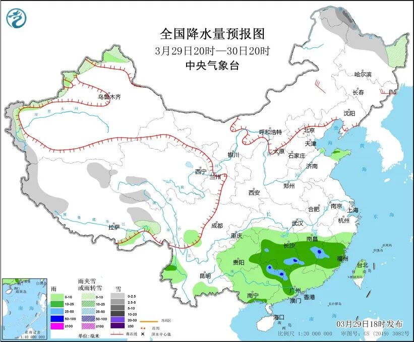 中央气象台预计,29日20时至30日20时,黑龙江北部、新疆西北部、西藏西部和东部、青海南部等地部分地区有小雪或雨夹雪,其中,黑龙江北部等地部分地区有中到大雪。江南南部和西部、华南北部、广西东南部沿海等地部分地区有中到大雨,局地有暴雨。