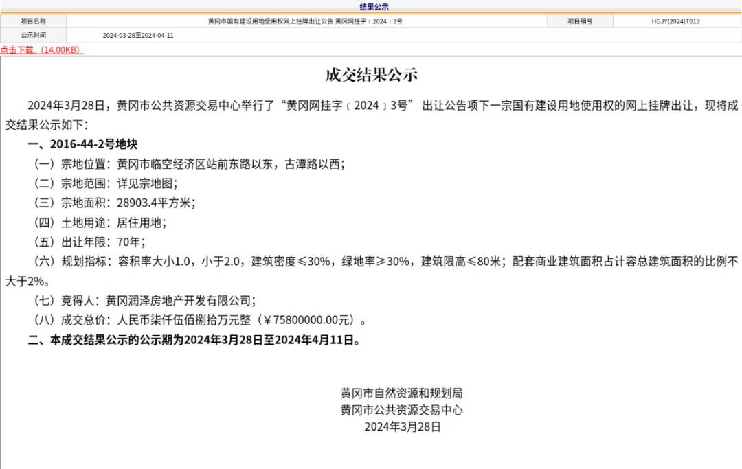 3月28日,在黄冈市公共资源交易中心举办的国有建设用地使用权网上交易活动中,黄冈市临空经济区2016-44-2号地块被黄冈润泽房地产开发有限公司以总价7580万元成功摘牌。