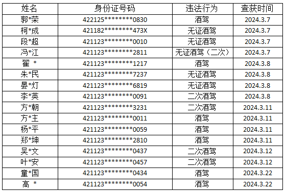 罗田县公安局交警大队持续加大对酒驾、醉驾、毒驾、涉牌涉证、超员、超载、超速、疲劳驾驶、非法改装等易肇事肇祸严重交通违法行为整治力度,现对近期酒驾违法行为人名单进行曝光,以警示广大交通参与者。 饮酒后驾驶机动车违法行为人名单
