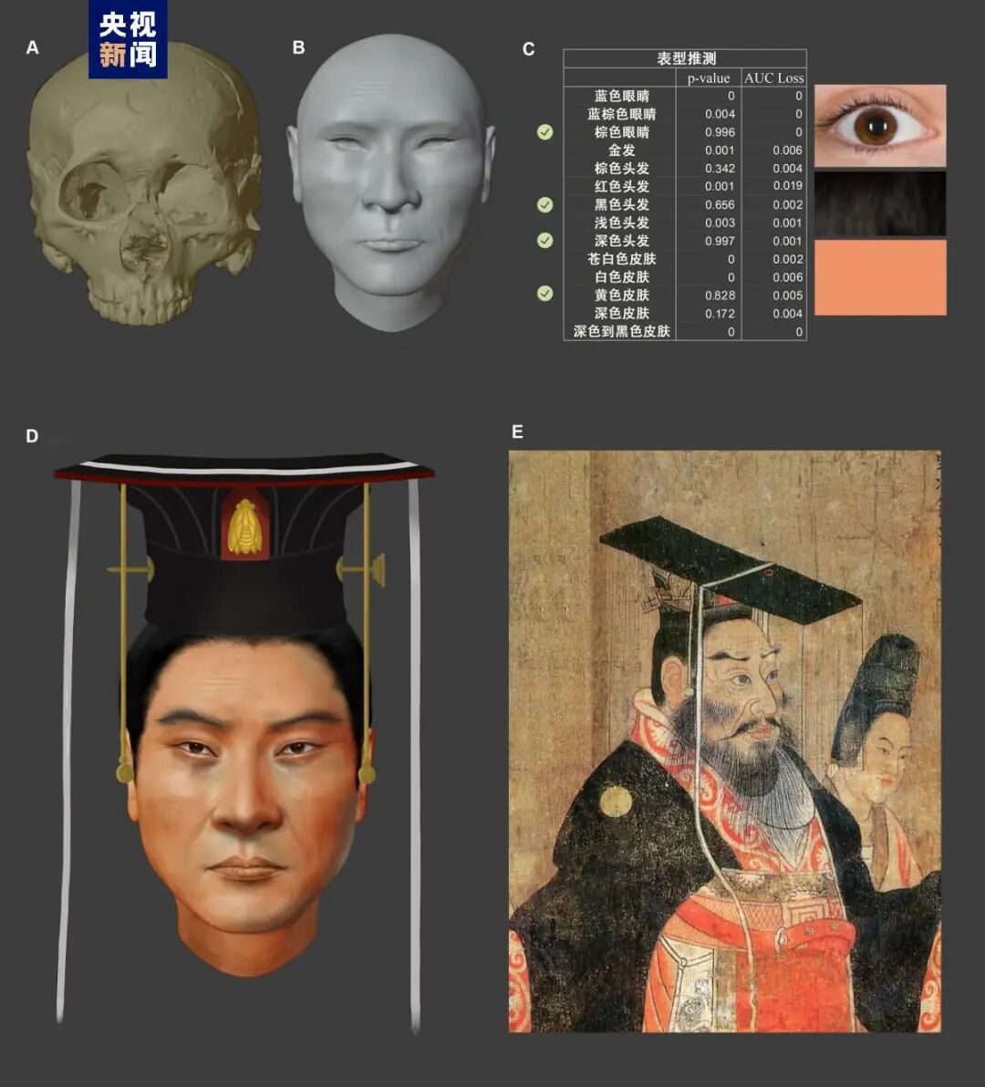 同时,研究团队还通过科技分析复原了北周武帝的面貌。以往,人们只能根据唐代著名画家阎立本的《历代帝王图》对北周武帝的容貌进行合理想象。本次研究中,研究团队以颅骨CT扫描技术对武帝进行了初步面貌复原。通过分析控制头发、皮肤和瞳孔色素相关的基因位点后,认为“武帝是黑色头发、黄色皮肤和棕色眼睛,符合典型的东北亚、东亚人长相。”