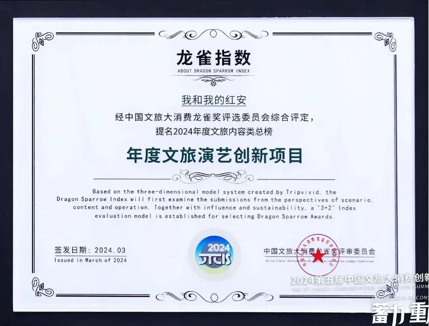 3月29日,在上海国家会展中心召开的“2024第五届中国文旅大消费创新峰会暨‘龙雀指数’发布盛典”上,中国首部沉浸式实景宣讲演艺《我和我的红安》荣获“年度文旅演艺创新项目”奖项。