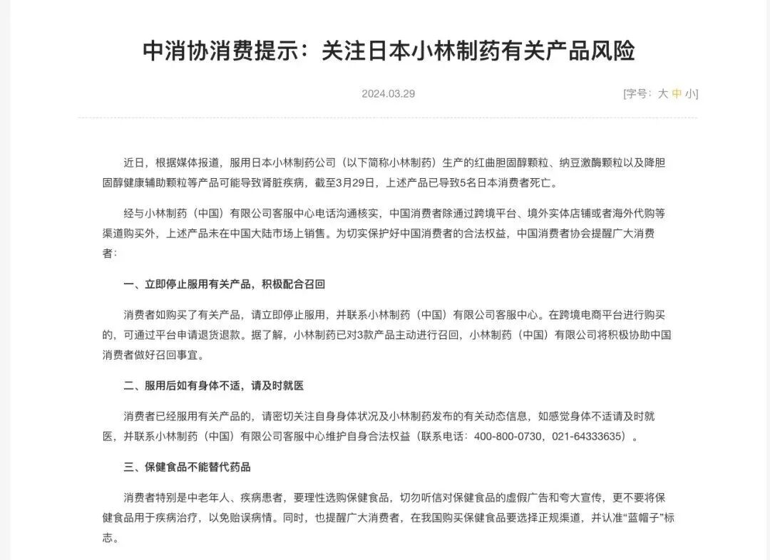 29日,中消协就服用日本小林制药公司生产的红曲胆固醇颗粒等产品导致消费者死亡一事发布提示:应立即停止服用有关产品,积极配合召回。