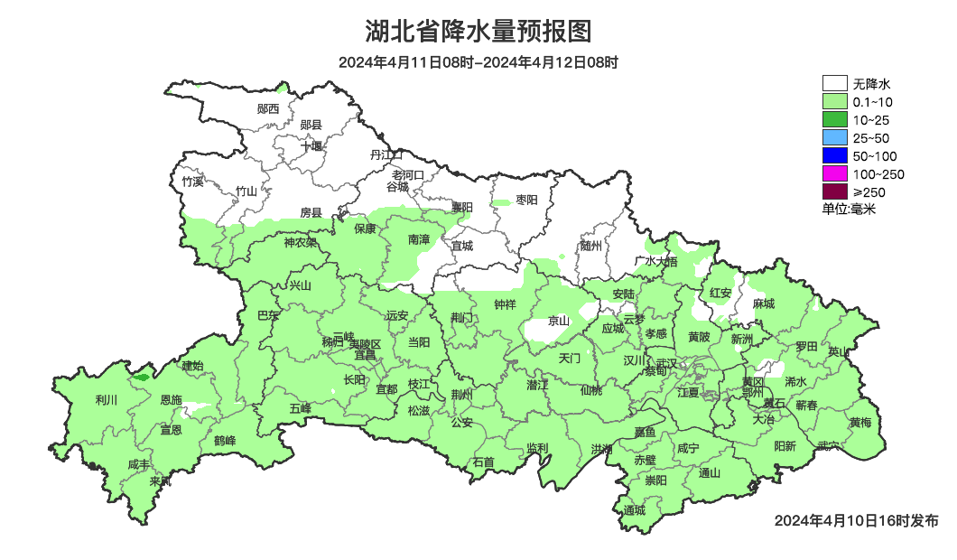11日08时-12日08时,鄂西南、江汉平原、鄂东南小雨转阴天;其他地区阴天到多云,局地有短时小雨。最高气温21~25℃,最低气温西部11~15℃、中东部15~18℃,偏东风2到3级。