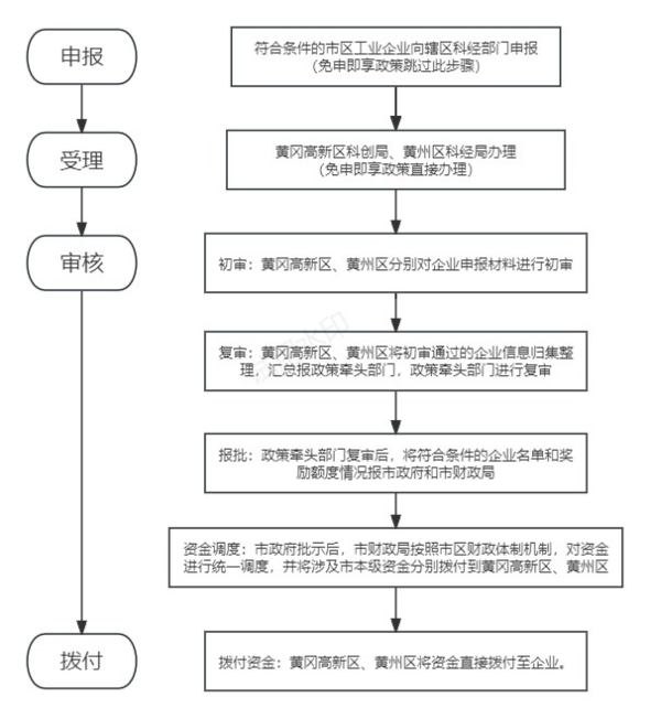 该项政策为免申即享政策。市经信局提供市区符合条件的企业名单,会同相关部门审核后,提出拟奖励企业名单及奖励资金额度。会商财政同意后,对拟奖励企业名单进行公示。公示无异议后,报市政府批准,奖励资金由黄冈高新区和黄州区分别兑付。