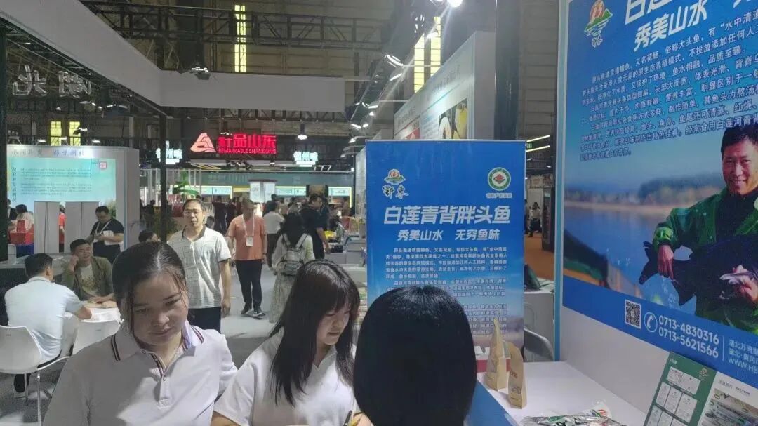4月12日,在广东东莞举办的第八届中国国际食品及配料博览会和第二届中国国际预制菜产业博览会上,在黄冈市白莲青背胖头鱼展区,来自海威达水产食品商行的市场部经理一行驻足观看,对人放天养的有机鱼给予称赞。
