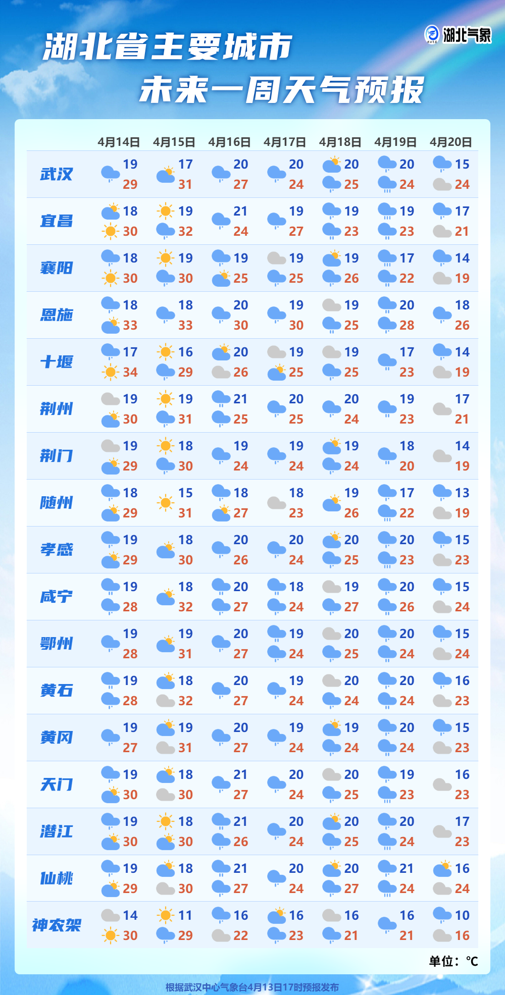 预报来源:武汉中心气象台2024年4月14日08时预报