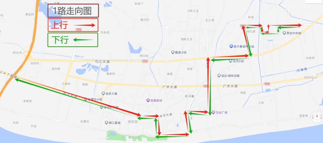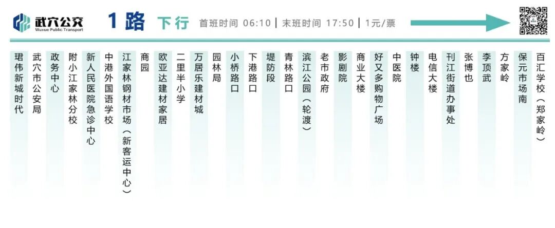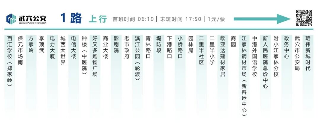 1路公交:起点为百汇学校(郑家岭),终点为珺伟新城时代,新增武穴市公安局、珺伟新城时代两个停靠点。