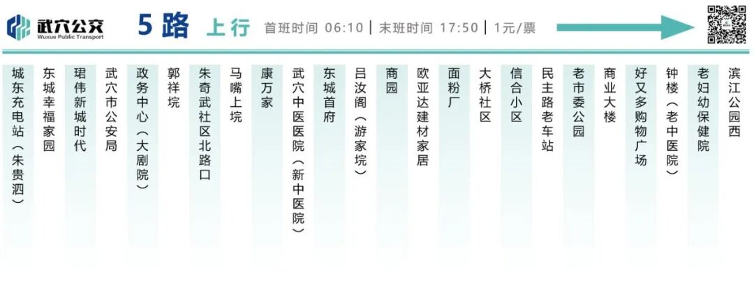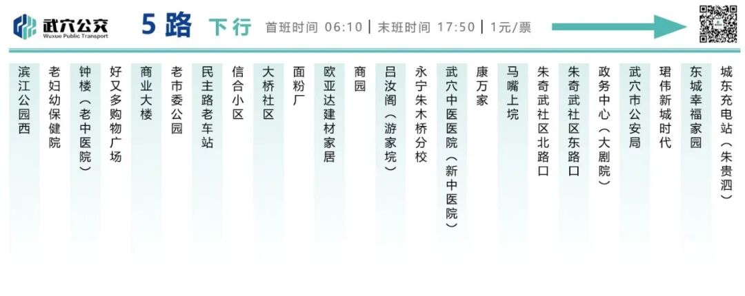 5路公交:起点为城东充电站,终点为滨江公园西,新增朱奇武社区、沿湖大道、新中医院等停靠点。