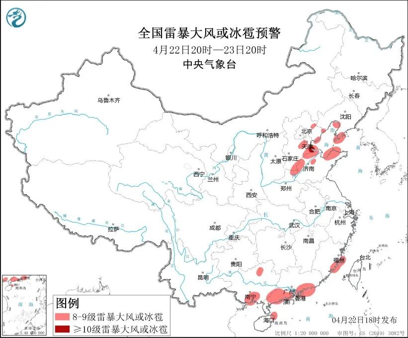 中央气象台22日18时继续发布强对流天气蓝色预警:预计22日20时至23日20时,辽宁南部、河北南部、天津南部、山东北部、河南东北部、福建东部、广西南部、广东南部及近海地区、海南岛东北部等地的部分地区将有8—10级雷暴大风或冰雹天气。