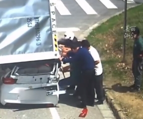 浙江湖州一辆大货车上的集装箱滑落,砸中旁边小轿车,母子三人被困。路人纷纷上前,合力将车门掰出口子,成功救出被困者。
