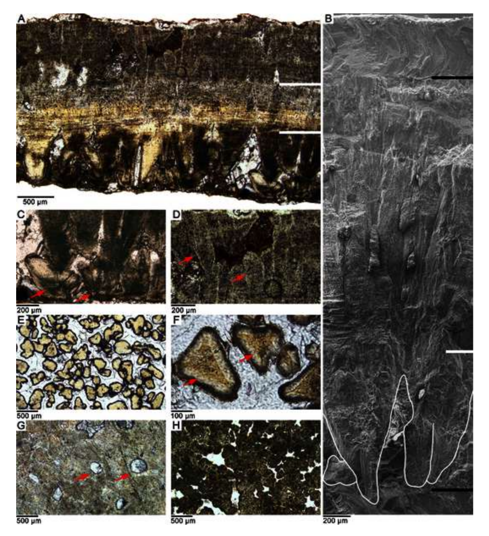 研究人员从“变形蛋”的径切面观察,发现其内部发育大量的锥形蛋壳单元组合,它们之间有较大的间隙;中间发育柱状蛋壳单元和小孔;最外层发育壳单元的分支,形成灌木状微结构。研究人员推测,“变形蛋”可能是鸭嘴龙的蛋,其年龄为晚白垩纪中期。