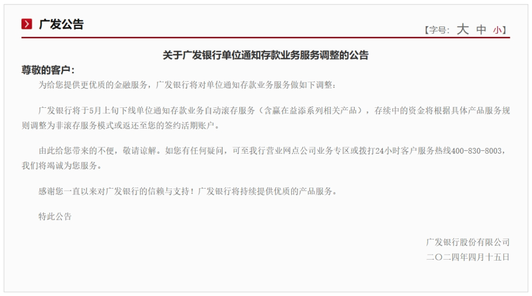 △图片来源:大连农商银行微信公众号广发银行广发银行日前发布公告表示,将于5月上旬下线单位通知存款业务自动滚存服务(含赢在益添系列相关产品),存续中的资金将根据具体产品服务规则调整为非滚存服务模式或返还至客户的签约活期账户。这一举措预计将对企业的财务管理带来一定影响。