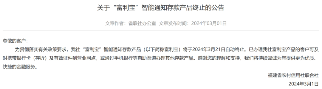 △图片来源:广发银行官网福建省农村信用社联合社今年3月1日,福建省农村信用社联合社发布《关于“富利宝”智能通知存款产品终止的公告》称,“富利宝”智能通知存款产品于2024年3月21日自动终止。随后,福州农商行、连江农商行、三明农商行等多家农商行、村镇银行相继跟进,于3月21日自动终止“富利宝”智能通知存款产品。