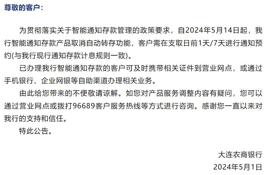 这一变化意味着,储户在存款到期后,将不再享受自动转存的便利,而需要主动进行存款操作。大连农商银行5月1日,大连农商银行发布公告称,自2024年5月14日起,大连农商银行智能通知存款产品取消自动转存功能,客户需在支取日前1天或7天进行通知预约(与大连农商银行现行通知存款计息规则一致)。这一调整无疑对储户的资金管理提出了更高的要求。