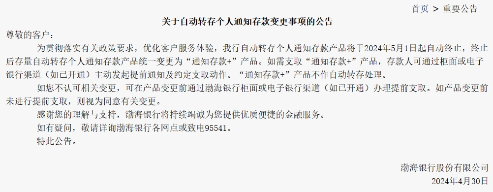 近日,渤海银行发布公告称,渤海银行自动转存个人通知存款产品于2024年5月1日起自动终止,终止后存量自动转存个人通知存款产品统一变更为“通知存款+”产品。
