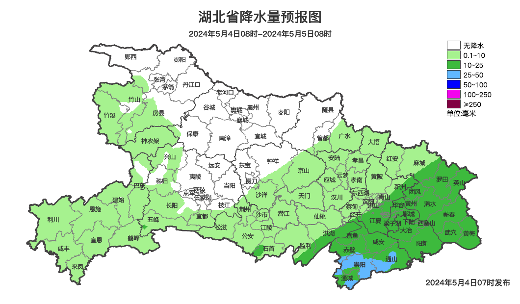4日08时-5日08时,江汉平原东部、鄂东南、鄂东北东部阴天有中雨,局地大雨并伴有雷电、短时强降水等强对流天气;鄂西北阴天到多云,局部有零星小雨;其他地区小雨转阴天。最高气温18~22℃,最低气温13~17℃,偏北风3到4级、阵风5到6级。