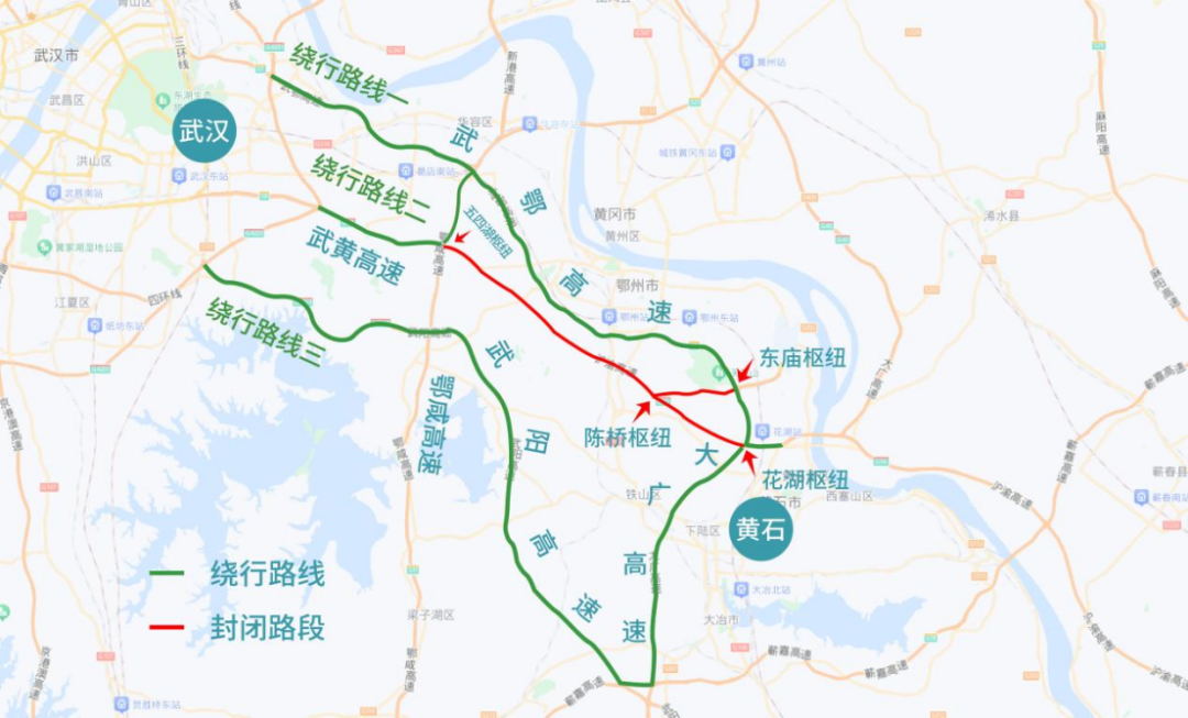 绕行路线一:车辆行驶至花湖枢纽互通,转武鄂高速往武汉方向。